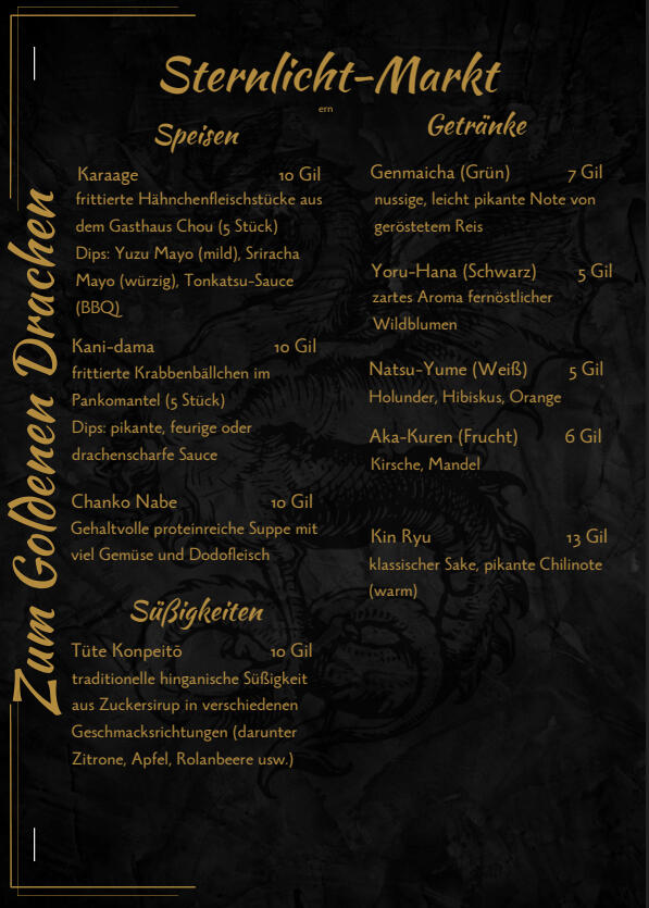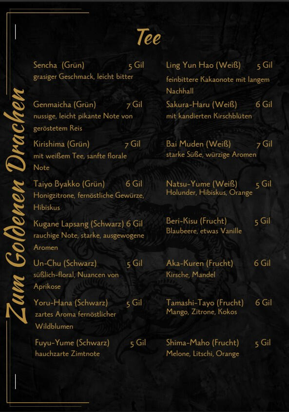 sowie Ruhe und Entspannung fern ab jeder Hektik.Hierzu bieten wir zwei verschiedene Varianten der Zeremonie an.Die kurze Teezeremonie - Preis pro Person: 250 Gil