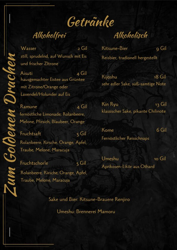 Von den idyllischen Apfelblütenhöfen La Nosceas bis hin zum traditionellen Zauber so mancher Machiya Shiroganes, hat der Tanz die kleine, blasse Mondstreunerin mit den Kohleaugen und dem Schneehaar geführt. Nun mag man es ihr nachsehen, dass sie auch im Drachen gern noch voller Frohsinn tänzelt, wenn sie beschwingt von Tisch zu Tisch geht, um Bestellungen aufzunehmen.
